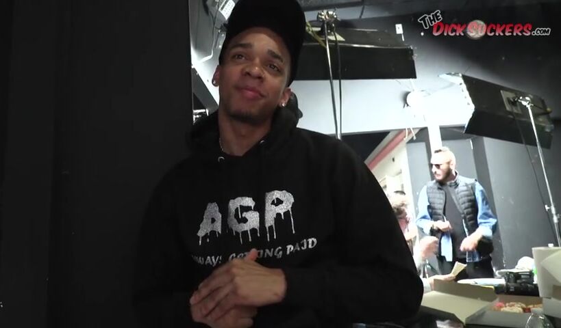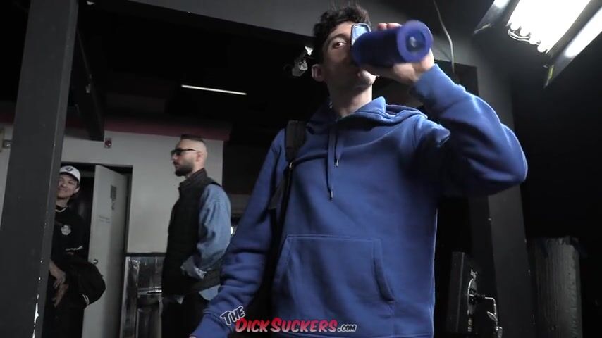 Babe in fishnet stockings Riley Reyes blowing two cocks at once